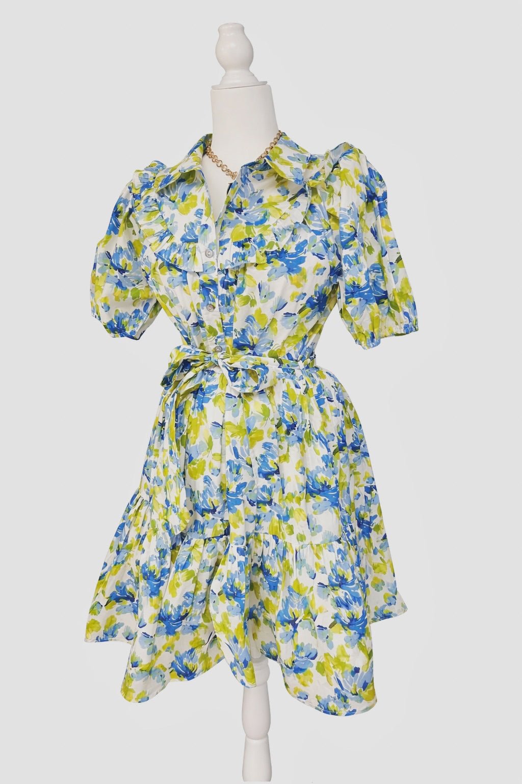 Soft, romantic, and effortlessly flattering, the Beyond The Horizon Floral Print Dress is a timeless piece you’ll reach for all season long. Featuring a dreamy blue and green floral print on a crisp ivory base, this dress is designed with feminine ruffle detailing across the bodice, short puff sleeves, and a button-front silhouette for a polished finish. The adjustable waist tie cinches you in just right, while the flowy skirt adds movement and charm! Lined. 100% Cotton.