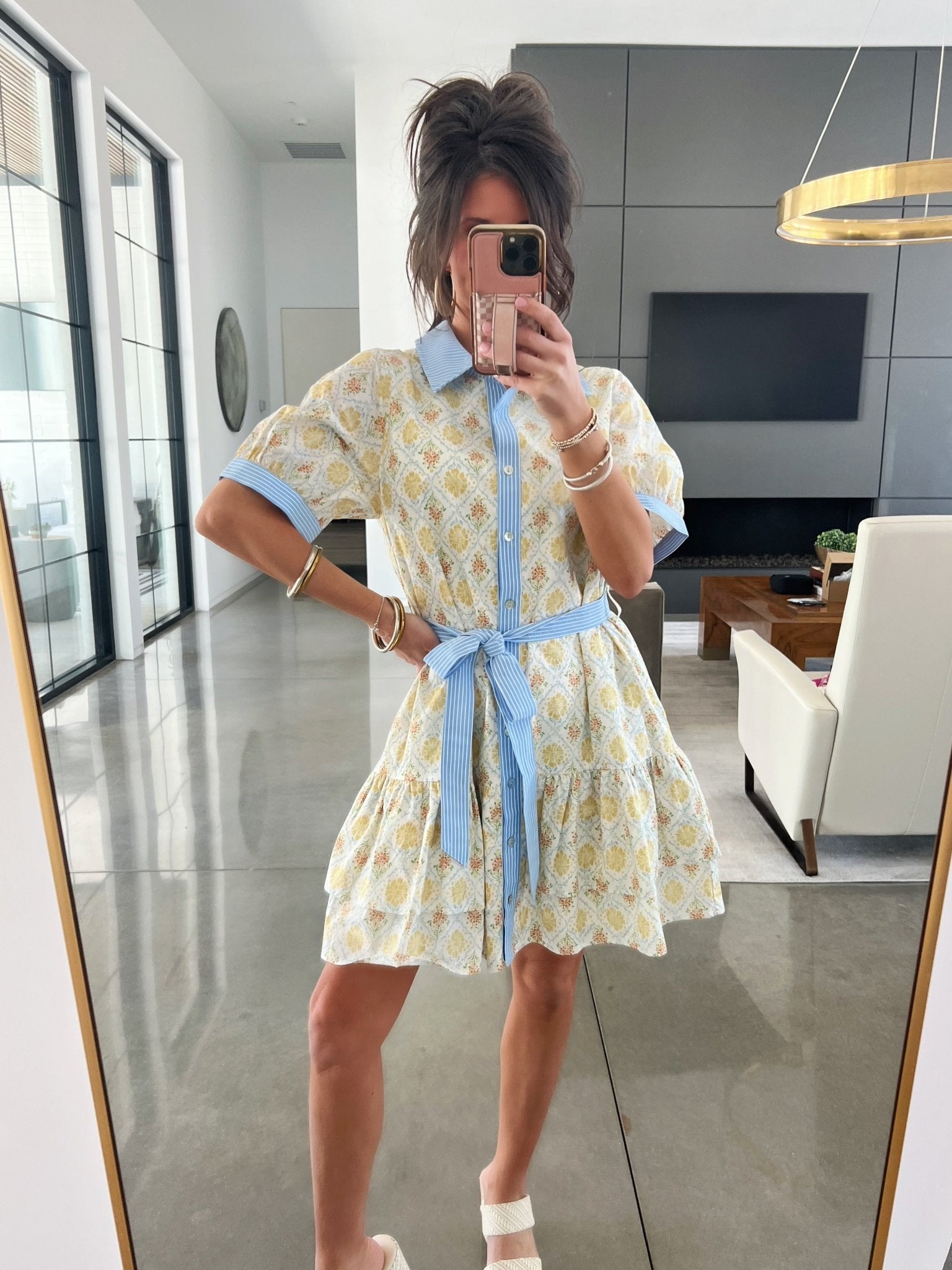 The collared neckline and button-front design add a polished touch, while the short puff sleeves bring subtle femininity. A matching self-tie belt cinches the waist for a flattering silhouette, flowing into an easy, breezy skirt that’s comfortable and effortless to wear!