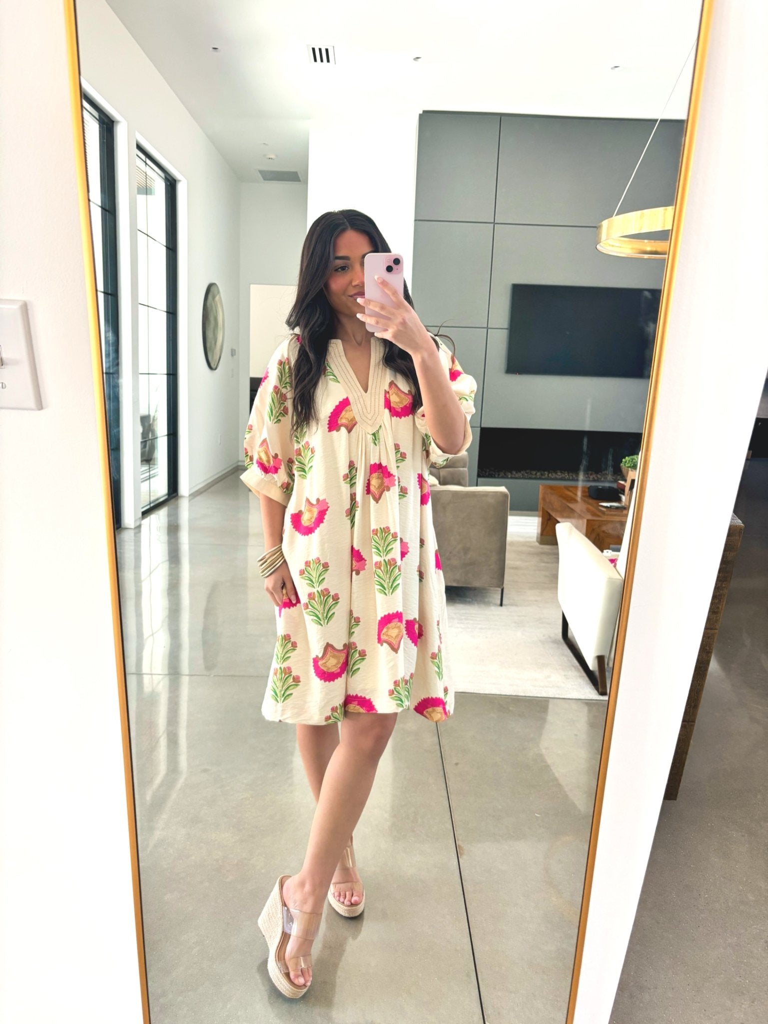 Soft, stylish, and effortlessly polished—the Easy Elegance Floral Shift Dress is the definition of throw-on-and-go chic. Featuring a relaxed shift silhouette, this dress showcases a cream base adorned with vibrant pink and green floral motifs for a fresh, eye-catching look.