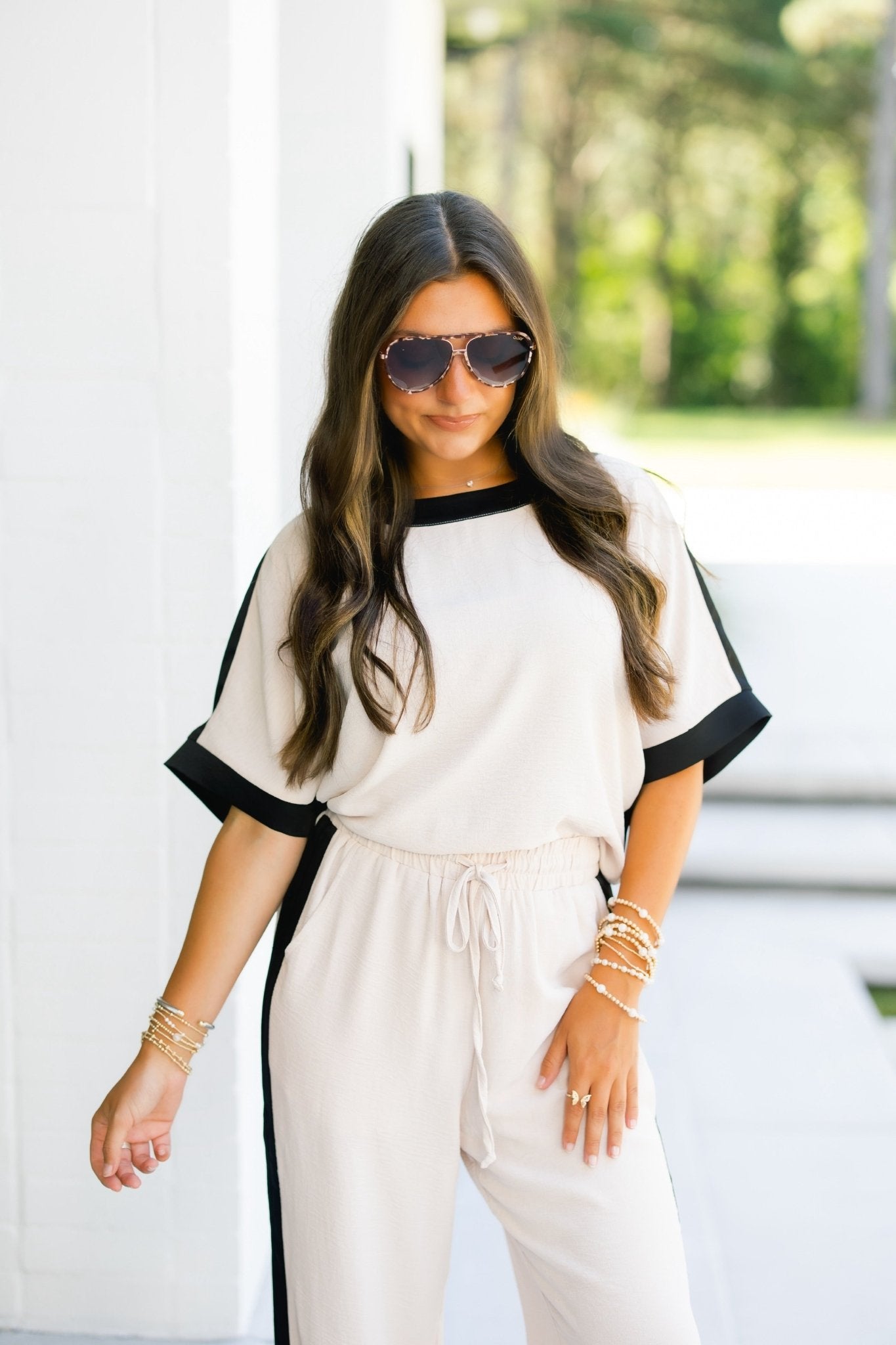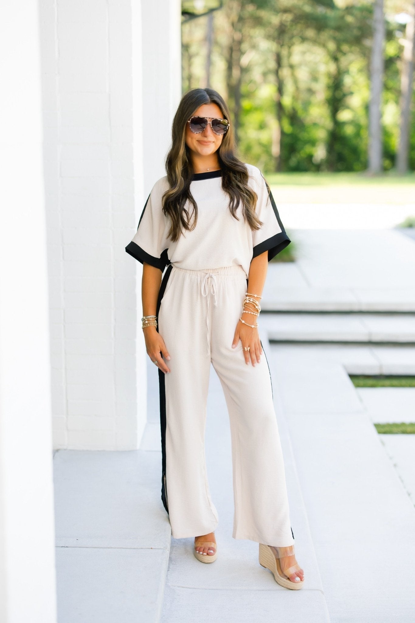 Discover effortless style with this cute and flowy oatmeal set, featuring a boxy top and wide-leg pants accented by sleek black trim. Its lightweight feel ensures all-day comfort, making it the perfect choice for a chic, relaxed look that moves with you. Elevate your wardrobe with this versatile must-have set. 95% Polyester 5% Spandex