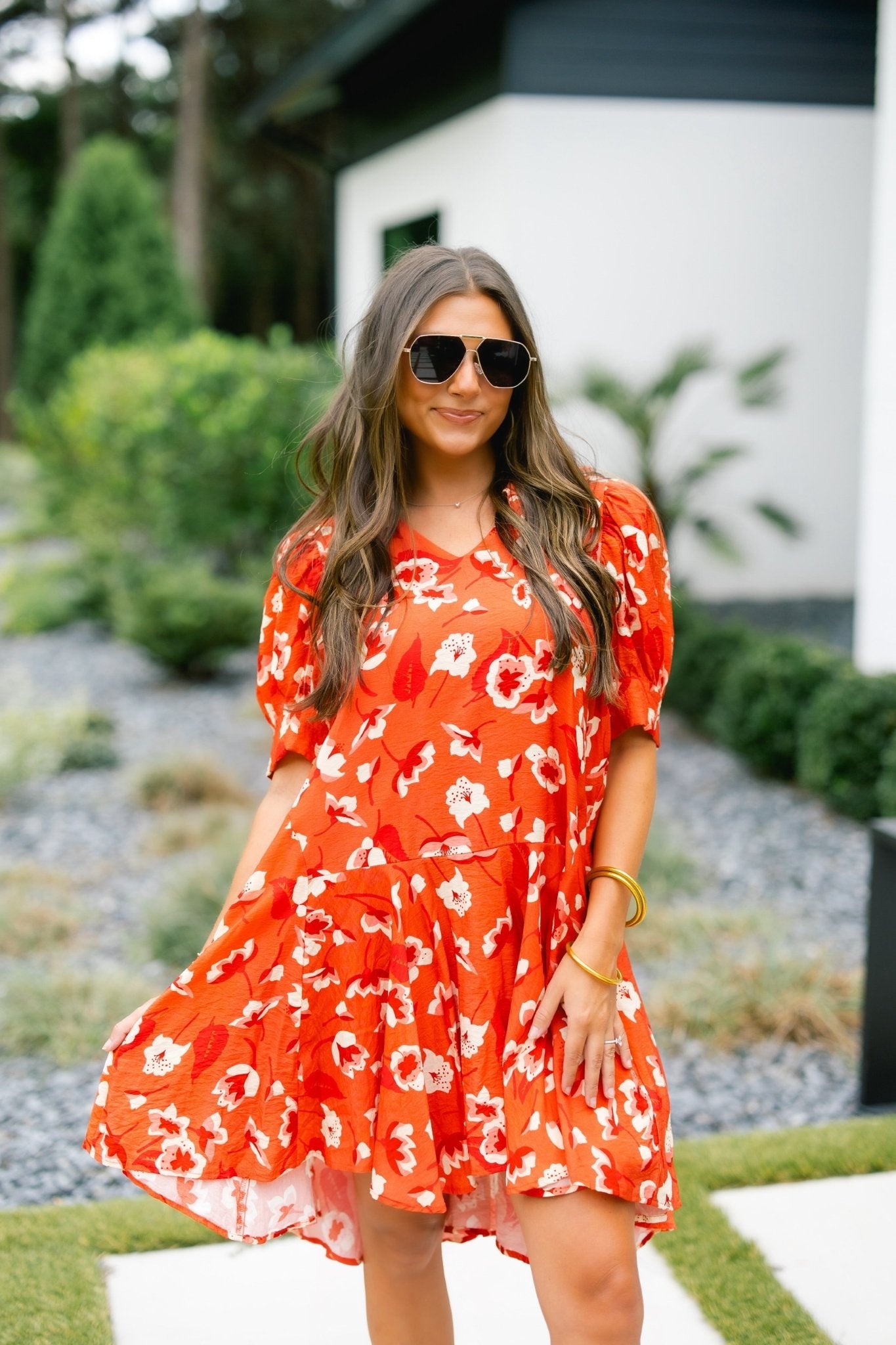 The Rest Assured Rust Dress features a sweet and feminine design with a flattering V-neck collar and a single-tiered silhouette. Its charming floral print adds a delicate touch, while practical pockets enhance everyday wearability. This mini dress combines style and comfort, making it a versatile addition to your wardrobe. Lined. 85% Rayon 15% Nylon